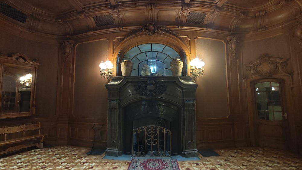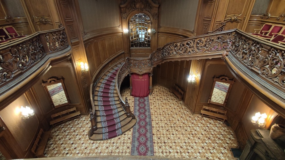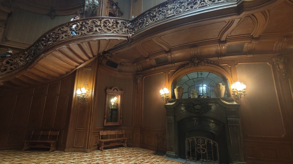 Интерьер один из красивейших, что я когда-то видел. Всё в резном дереве, шикарная лестница и холл с прозрачной крышей. Очень классно! Какой-то Хогвартс прямо )))