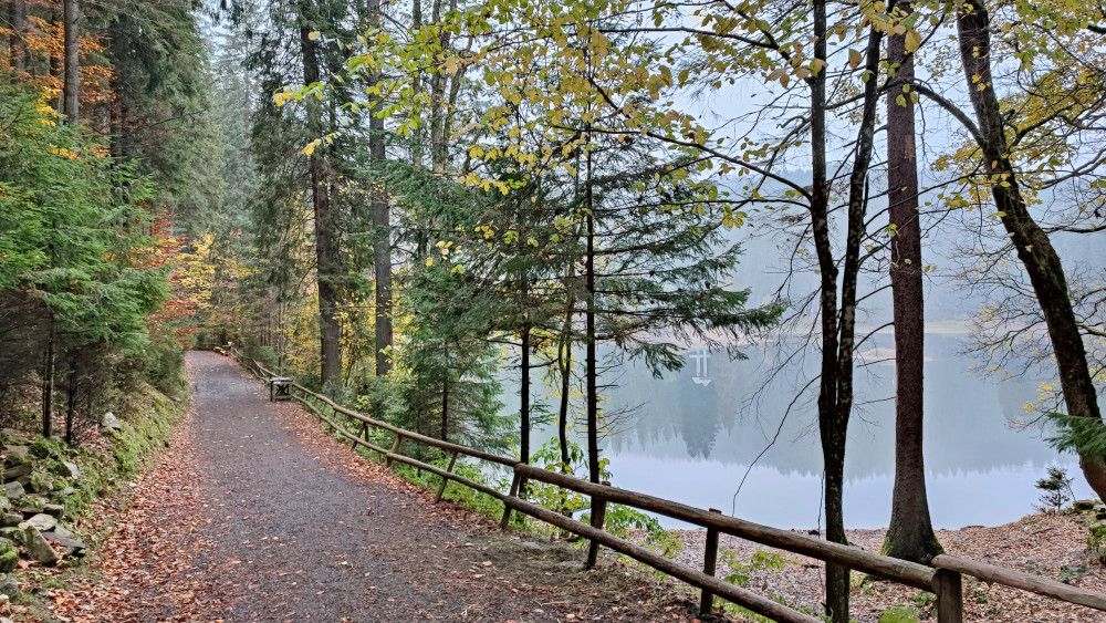 На початку, при вході – оглядовий майданчик. Навколо озера є еко-стежка, якою можна обійти озеро, що ми й зробили. Серед озера є невеликий острів. На протилежному від оглядового майданчика березі - скульптура з величезних колод, з вирізаними на них жінкою - Синь і чоловіком - Вір.