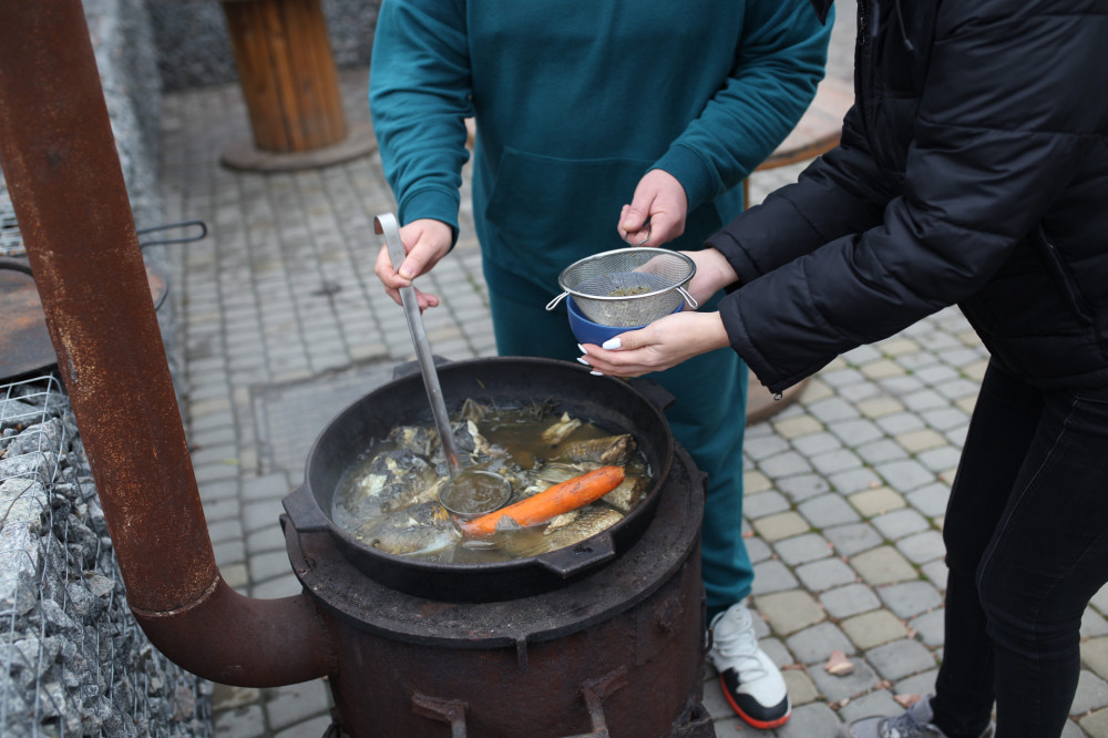 Правда людям приезжим просто вот так сразу сложно погрузится в даль минувших эпох нашего города, но это дело поправимо. Для этого можно использовать локальные алкогольные продукты, которые несут в себе энергию нашего солнца и никого не способны оставить равнодушным. Особенно если их несколько видов. А если еще и под ароматную, обжигающую уху, да заправленную пикантным тузлуком... И как бы это кощунственно не прозвучало, но уха – это только начало, для большего разжигания аппетита. На очереди филе рыбы, в приготовлении которого гости принимают непосредственное участие, самостоятельно экспериментируя со специями. В этот раз гвоздями программы был пеленгас и камбала глосса. Когда процесс подготовки блюд закончен, шеф-повар отправляет его в хоспер-печь. Томительное ожидание скрашивается продолжением экскурсии и конкурсами, а так же принятием согревающих душу и тело напитков. Когда основное блюдо готово, наступает кулинарная пауза, которая сопровождается поеданием нежнейшего мяса Азовской рыбки, запеченной с пряностями.
