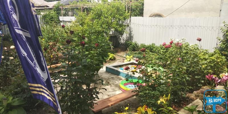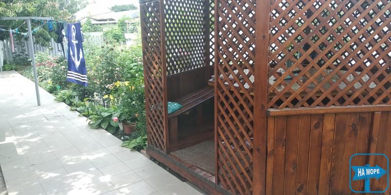 Удобная територия, две кухни , несколько умывальников, три душа, множнство цветов, отдельная беседка, место для стирки и сушки белья, отдельный вход в номер, первый этаж, место для парковки автомобилей, мангал, шампура, песочница.