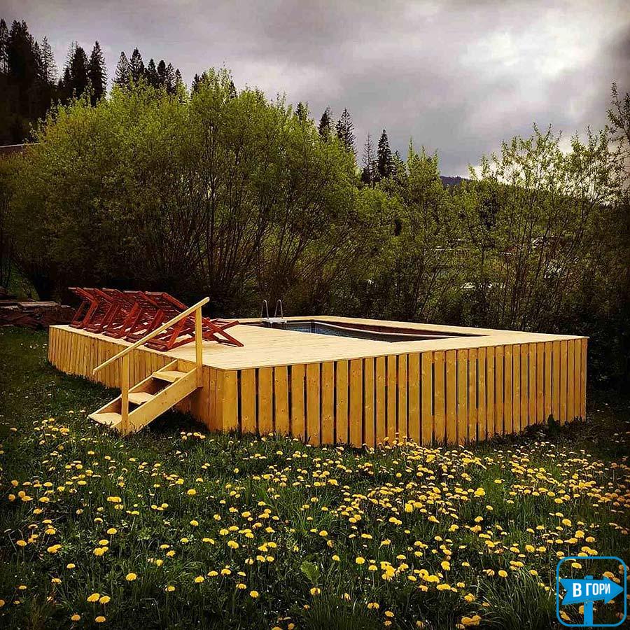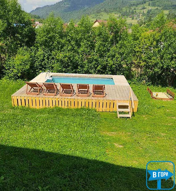 На территории расположен двухэтажный коттедж на 8 мест с террасой, качели, летний бассейн, детская площадка.