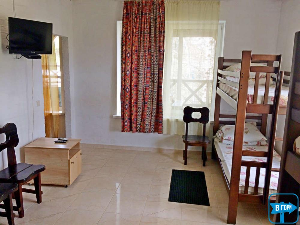 Четырехместный — двухкомнатный номер достаточно большой площади: в первой комнате — двухспальная кровать, телевизор, холодильник, балкон, во второй — двуспальная или две односпальные кровати, санузел (туалет, умывальник, душевая кабина). Комнаты между собой разделены аркой. Есть возможность доставки дополнительного спального места.