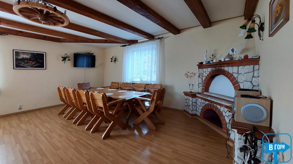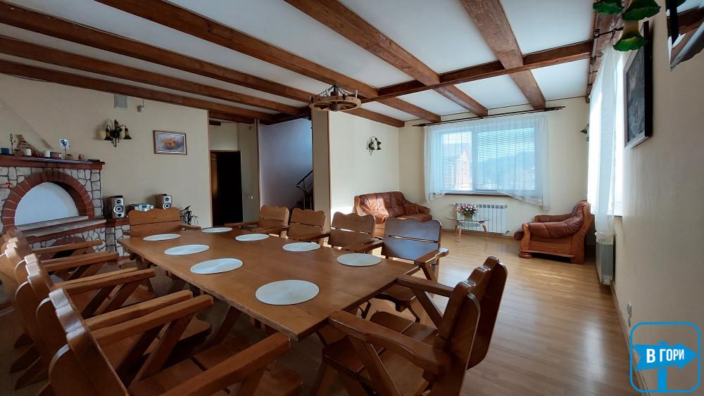 - гостиная с камином (большой обеденный стол со стульями, телевизор, мягкая часть),