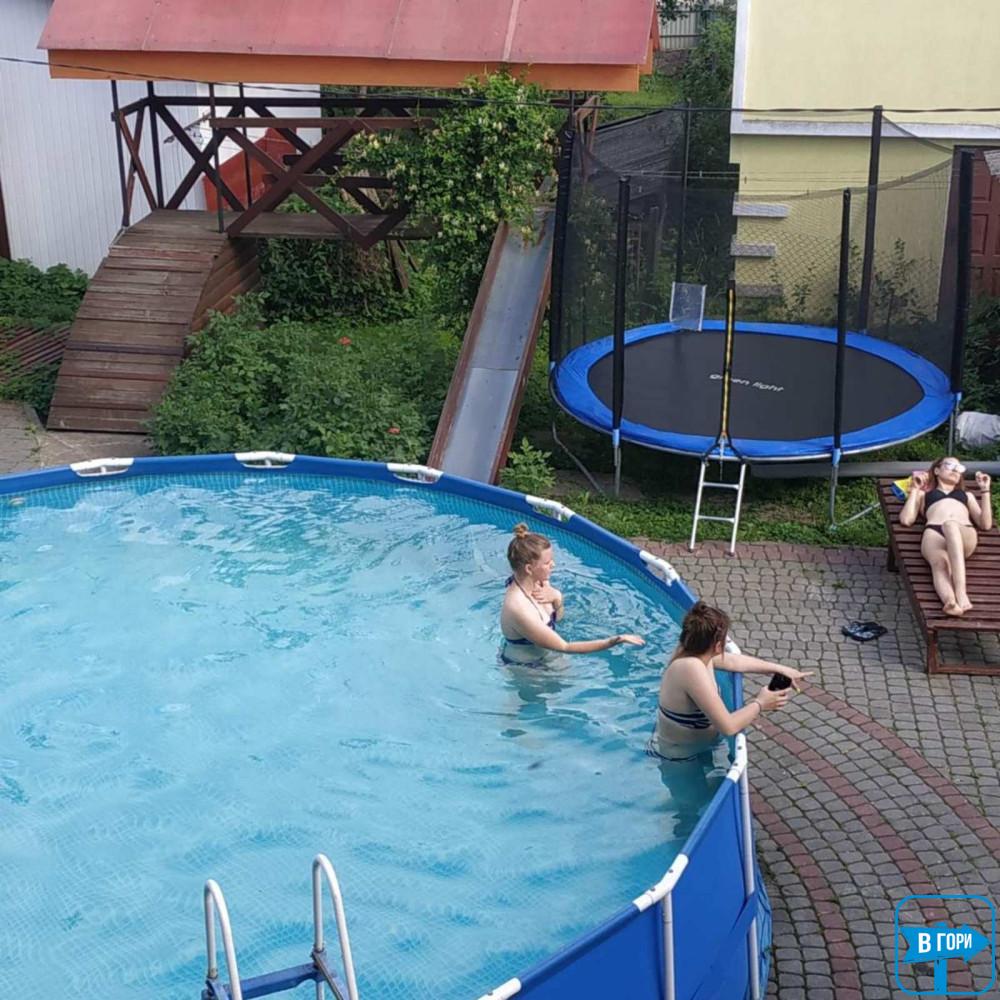 На территории есть большой летний бассейн, 6 беседок с мангалами, детская площадка, батут, сауна, парковка с видеонаблюдением.
