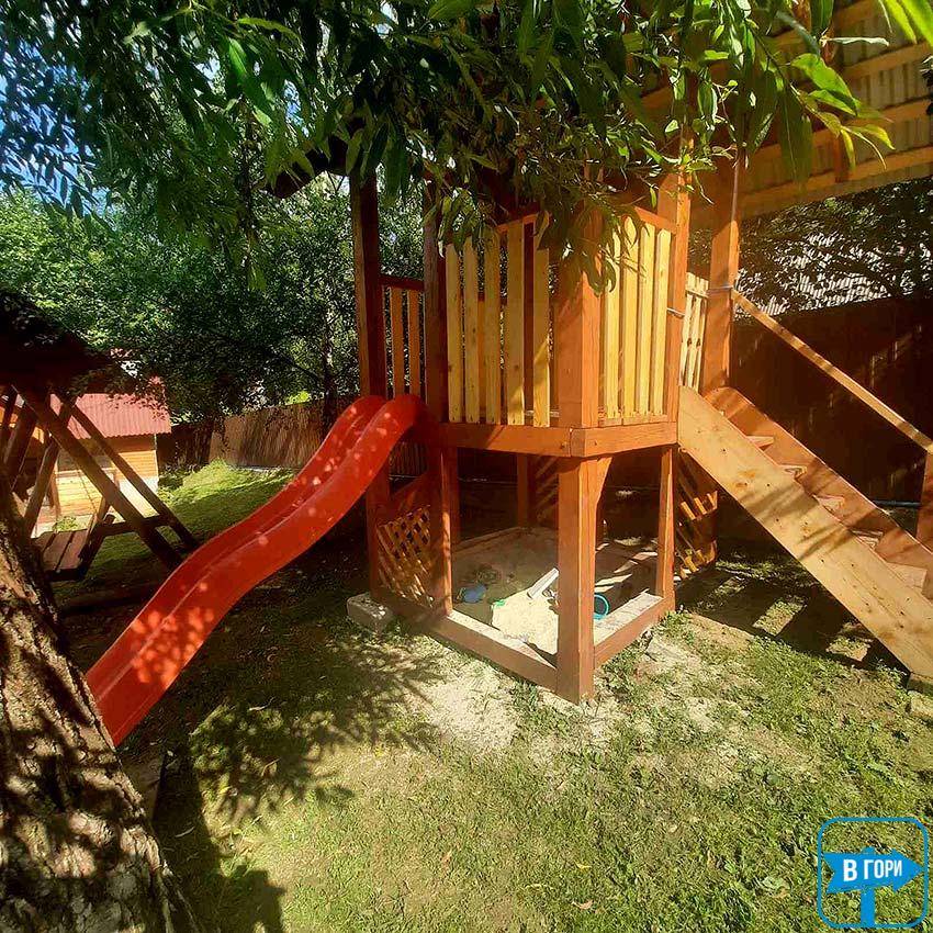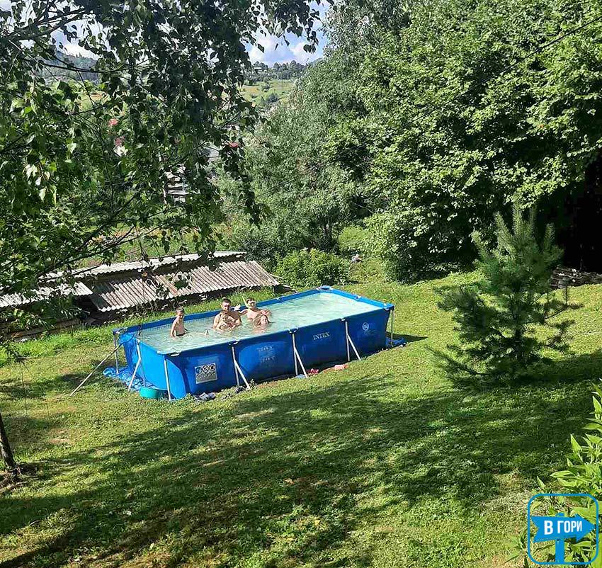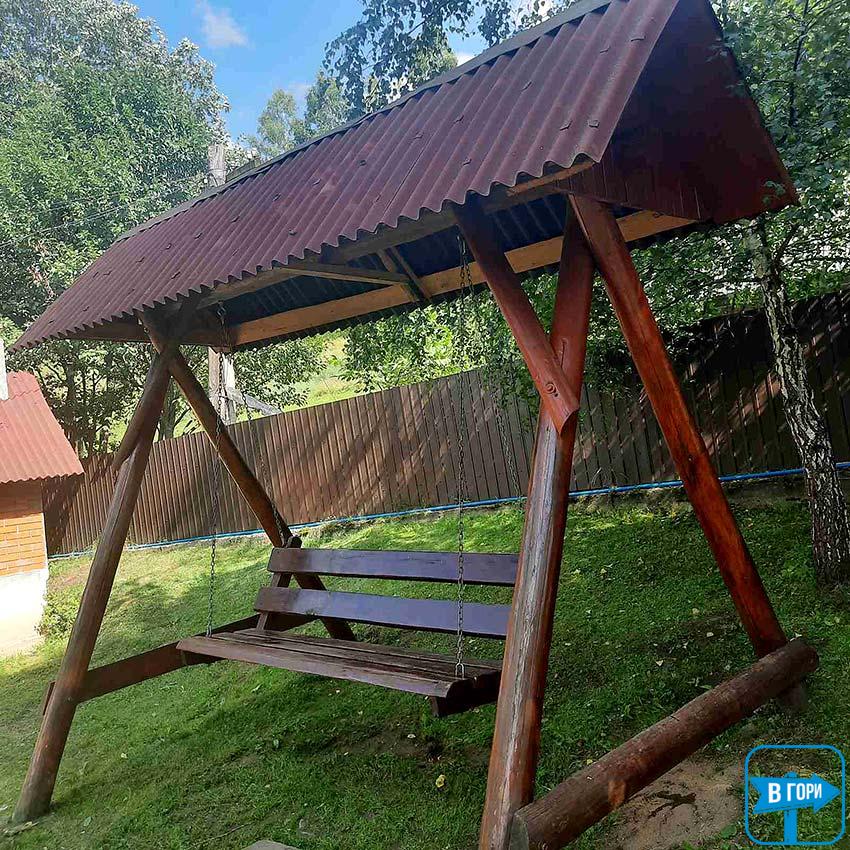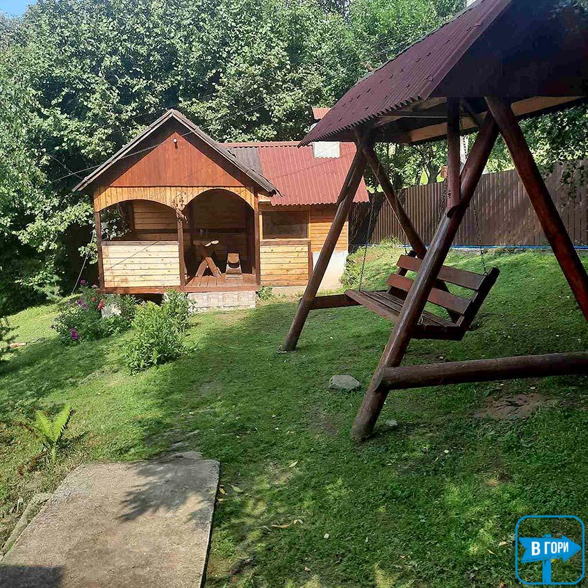 Во дворе есть беседка, мангал, качели, детская площадка и летний бассейн.