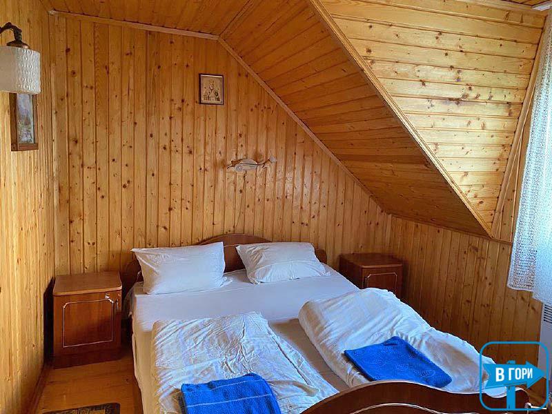 На втором этаже — 3 двухместные комнаты (в каждой есть двуспальная или 2 односпальные кровати);