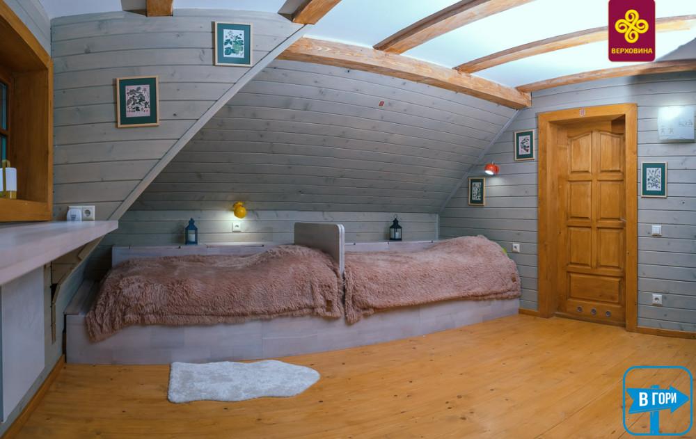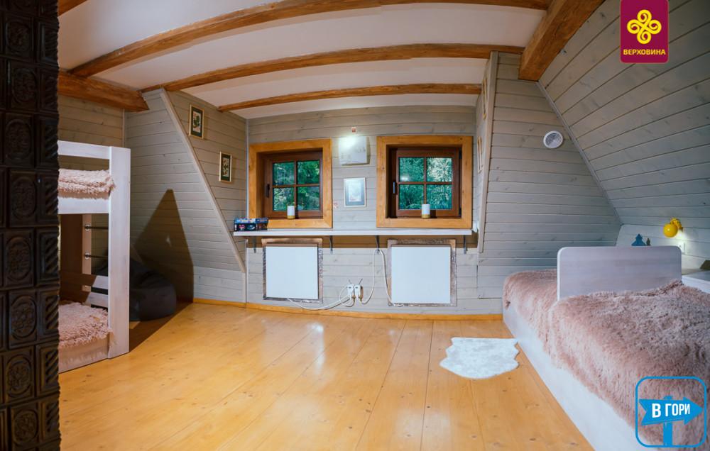 На втором этаже – просторная гостиная, секретная двухместная комната (на чердаке), четырехместная комната оборудована двухъярусной кроватью и двумя односпальными с ортопедическими матрасами, шкафом для хранения вещей, вешалкой для одежды, санузел на этаже (душевая кабинка, туалет, умывальник).