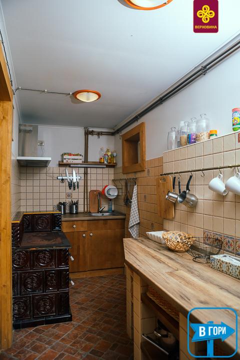 На первом этаже — гордость заведения – настоящий кафельный рисованный гуцульский пьец, большой стол, телевизор, кухня со шпаргатом (электрическая плита, холодильник, мультиварка, электрочайник, необходимая посуда).