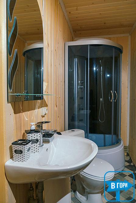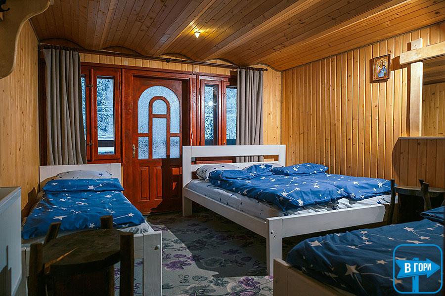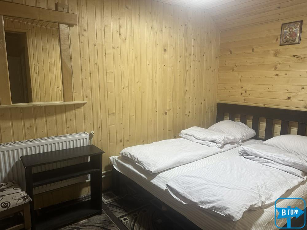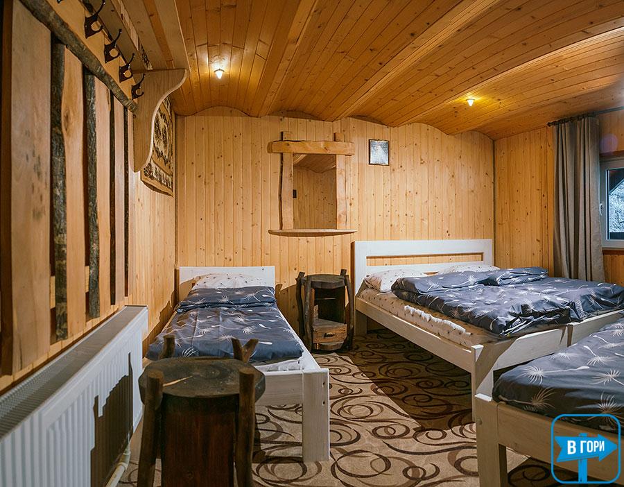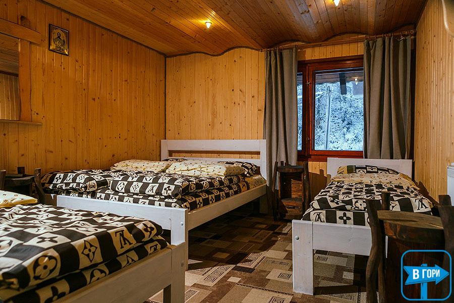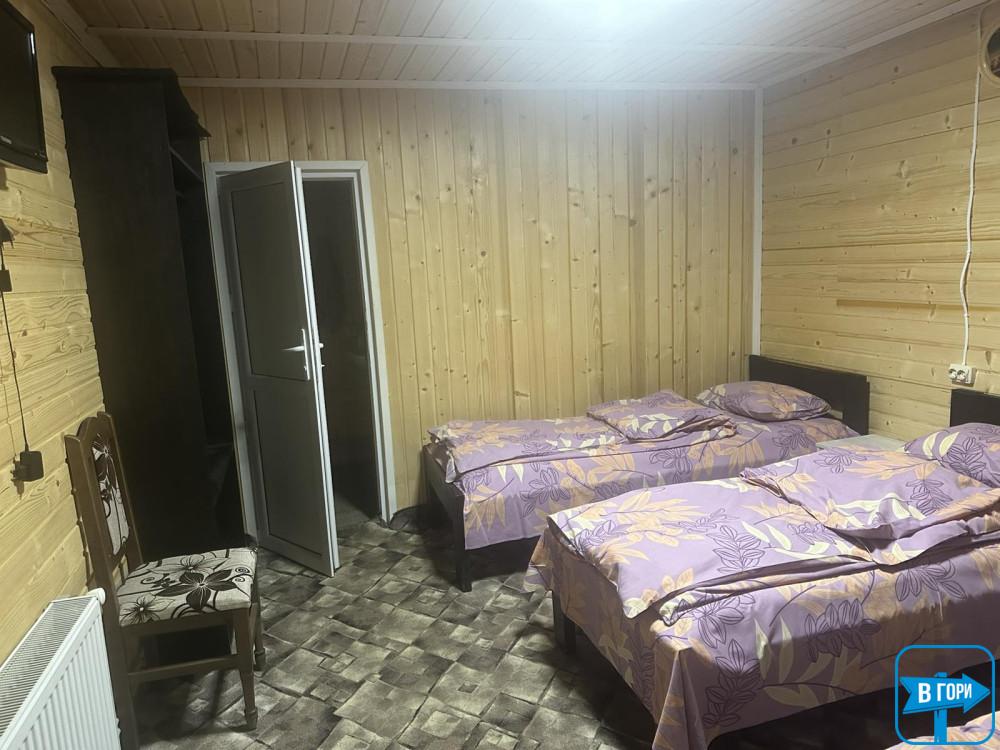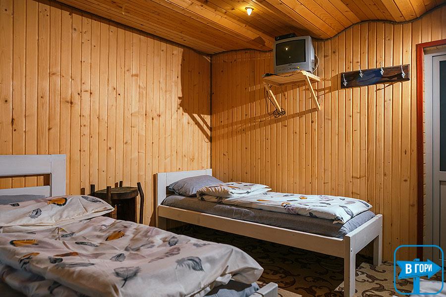 В коттедже - 4 трехместных номера (в каждом есть двуспальная и односпальная кровати, вешалка для одежды, телевизор; санузел - душевая кабина, туалет, умывальник). Каждый номер имеет отдельный вход снаружи.