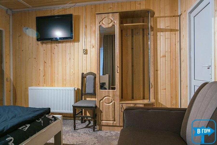 4 двухместных номера (в каждом есть двуспальная кровать, шкаф для одежды, телевизор, дополнительное место — раскладной диван; санузел — душевая кабина, туалет, умывальник). Каждый номер имеет отдельный вход снаружи.