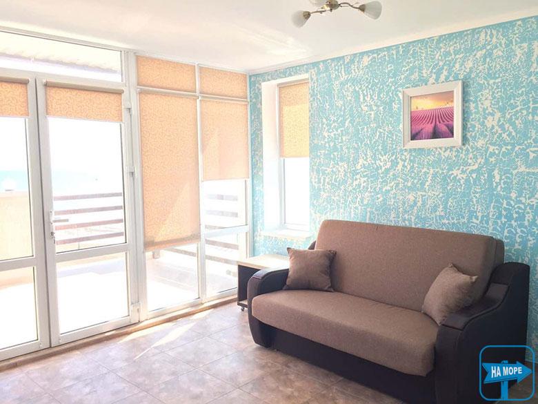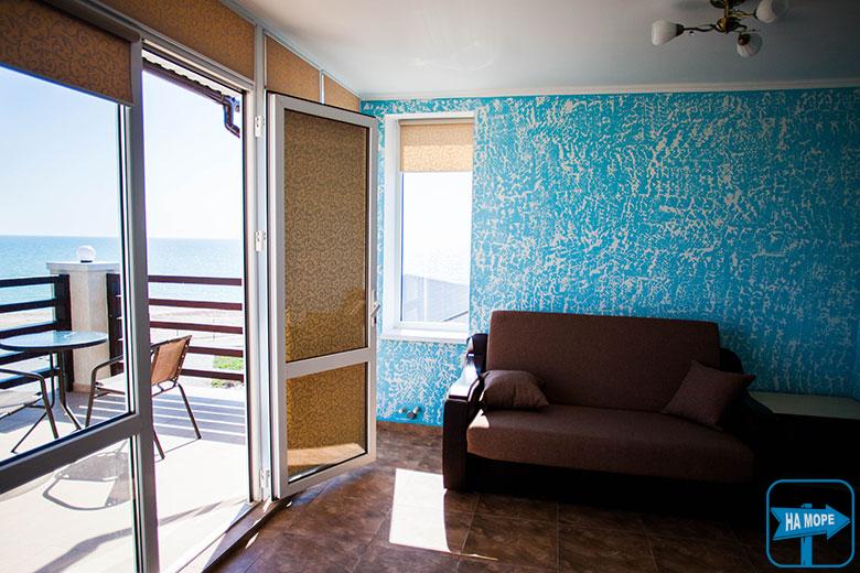 «Премиум Коттеджи»: трехуровневый коттедж с захватывающим панорамным видом на побережье с каждого этажа. В номере удобная двуспальная кровать с ортопедическим матрацем, дополнительные раскладные диваны, полноценный кухонный уголок с электропечью, микроволновкой, холодильником, набором посуды, в каждой комнате телевизор, бесплатный Wi-Fi. На каждом этаже - отдельные санузлы и душевые. На третьем этаже большой стеклянный витраж с выходом на террасу, который позволит в любую погоду любоваться панорамным видом на море и наслаждаться звуком прибоя. Наша особая гордость - пляж, где для проживающих в этом номере зарезервированы бесплатные навесы с шезлонгами. Возможность размещения до 6 человек! Площадь: 150 кв. М