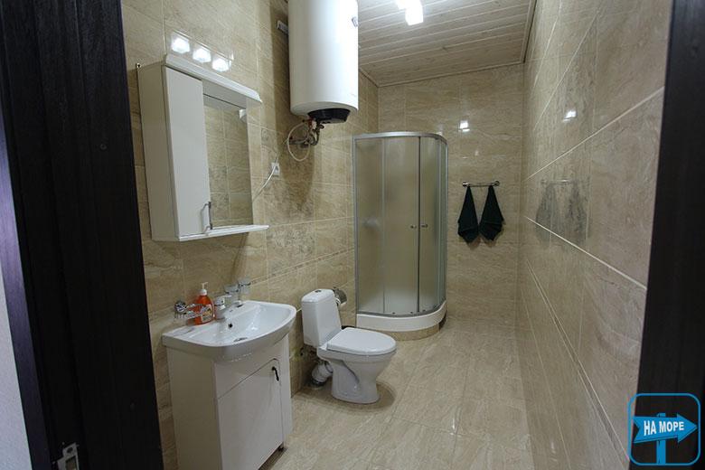 Для размещения большой компании до 8-ми человек, мы можем предложить вам апартаменты на 1-ом этаже 2-х этажного нового дома. Номер 90 кв. метров состоит из холла, со встроенной современной кухней, 3-мя спальнями, санузлом полной комплектации, стиральной машиной, с бесперебойной подачей холодной и горячей пресной воды и большой террасой. Комплектация холла: двуспальная кровать, встроенные шкафы-купе, необходимая мебель. Возле дома есть парковочное место на 2 автомобиля (бесплатно), свой мангал (бесплатно).