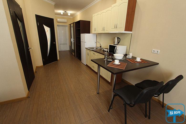 Апартаменты «Студия» однокомнатные 2-х и 3-х местные представляют собой комнату- студию площадью 25 кв. метров , со встроенной современной кухней и санузлом полной комплектации, с бесперебойной подачей холодной и горячей пресной воды. Комплектация номера: двуспальная кровать, необходимая мебель, сплит-система, спутниковое ТВ, оборудованная кухонная зона с электроплитой, СВЧ-печью, электрочайником, холодильником и полным набором посуды.