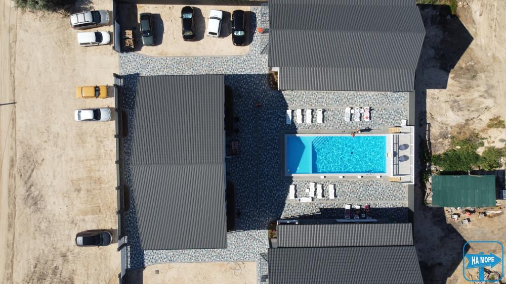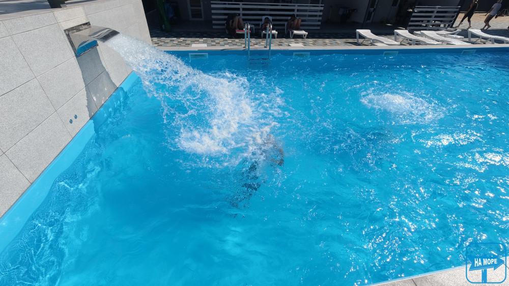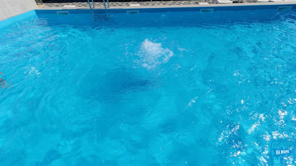 - На территории отеля есть бассейн с подогревом и шезлонгами, детская площадка, батут и бар