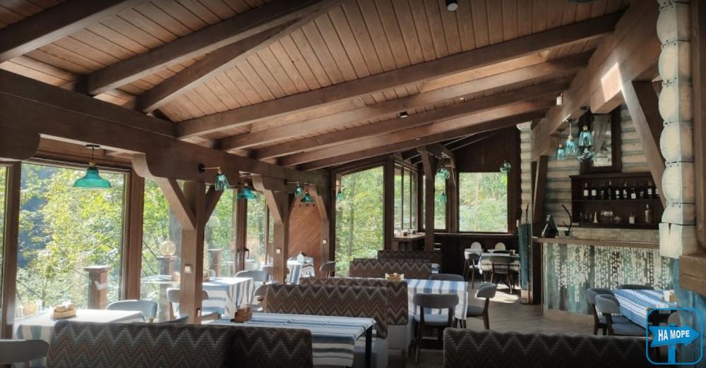2 зала с отоплением, где максимально могут расположиться 50 персон, летняя терраса с видом на реку и горы, беседка на берегу реки.