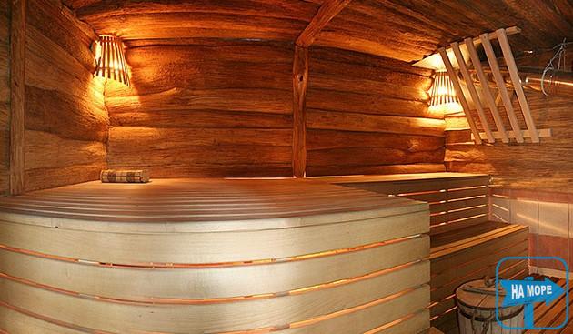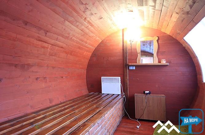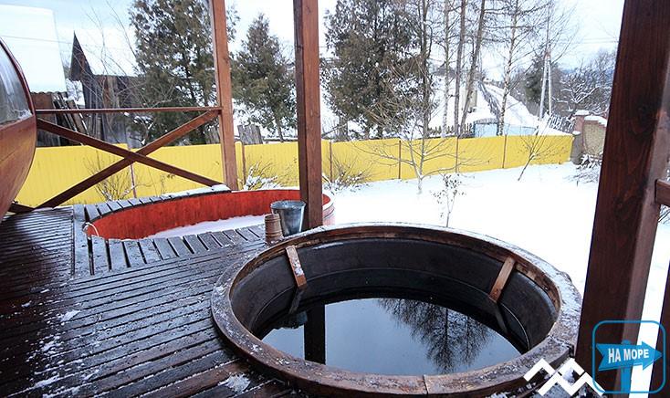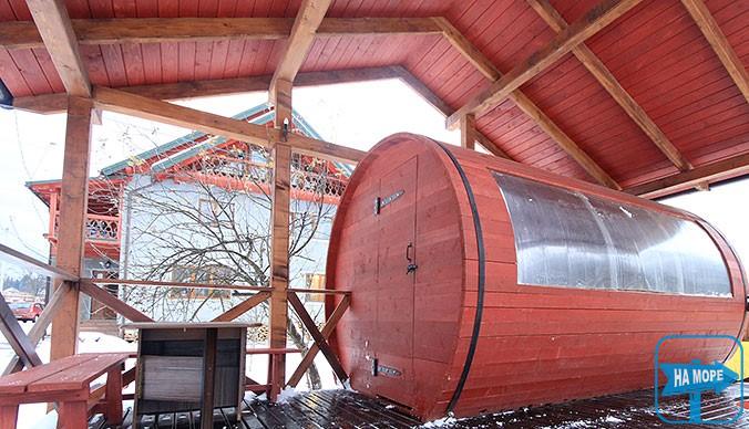 Чан на травяных сборах на 4-5 человек. Рядом есть бочка с холодной водой (принцип контрастного купания).