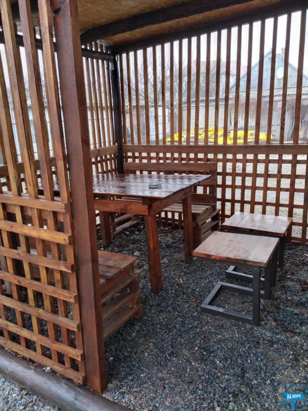 Біля кожного номера свої дерев'яні альтанки стіл та стільці.