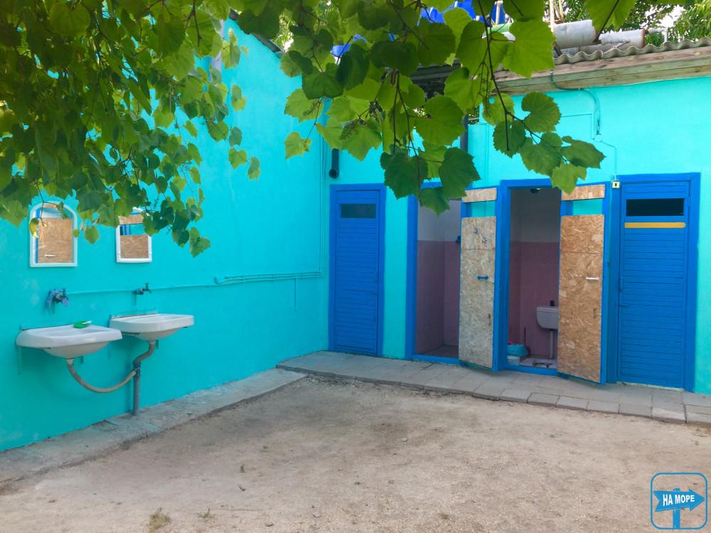 На території розташовані сучасні туалети зі зливом води, умивальники та душові. Є напрокат вентилятори. Можна у адміністратора безкоштовно додатково брати в будиночок чи номер посуд, інвентар, ковдри, подушки.