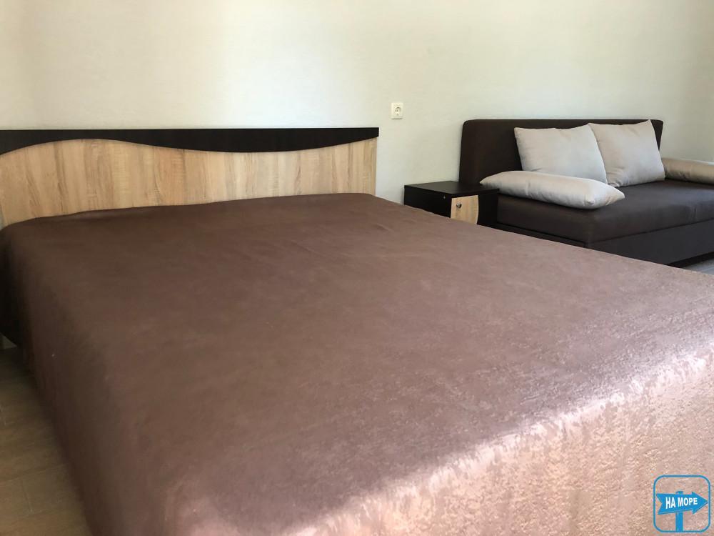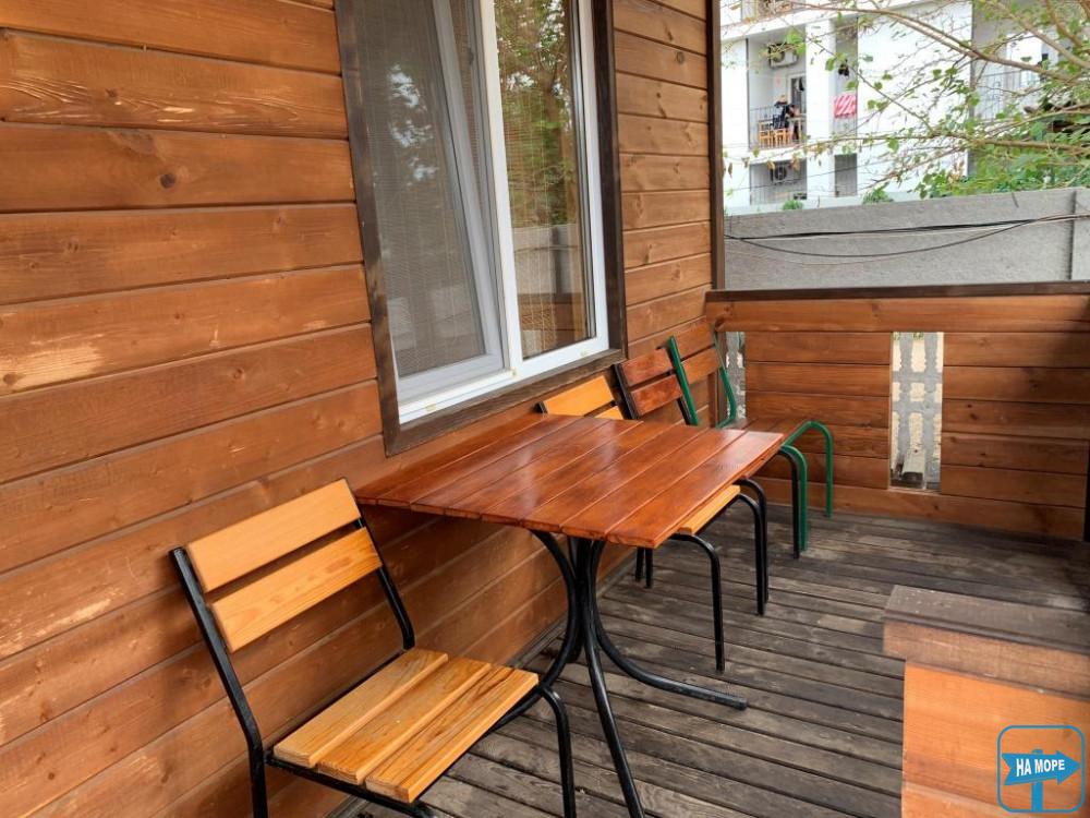 Меблі: двоспальне ліжко з ортопедичним матрацом, двоспальний розкладний диван, кухня-студіо, шафа, тумба, столи та стільці на терасі-веранді.
