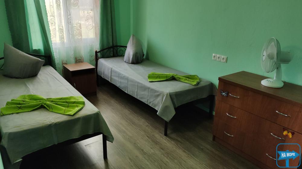 дві не прохідні кімнати 3х4 - у кожному дерев'яному одному і двох спальні ліжка, супутникове ТБ, WI-FI, кондиціонер, комплект постільної білизни;