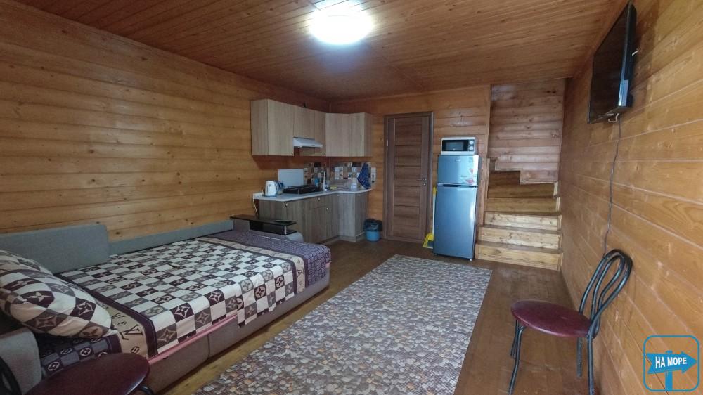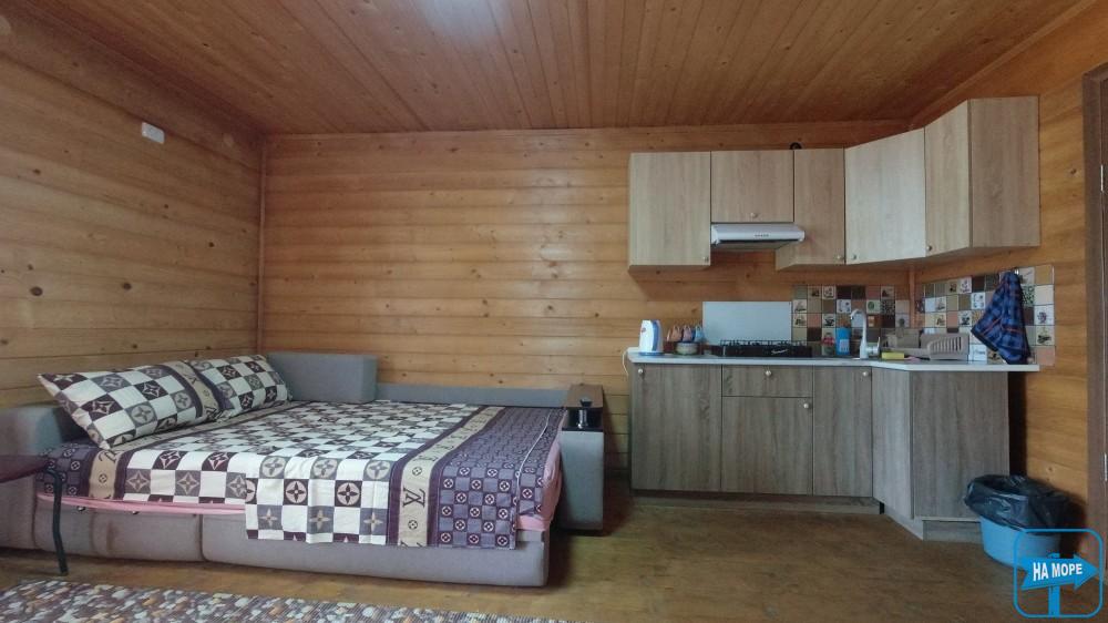 На першому поверсі розташована кухня-їдальня обладнана всією необхідною побутовою технікою, санвузол, ТБ, двоспальний диван.