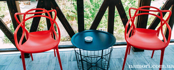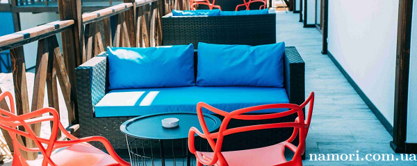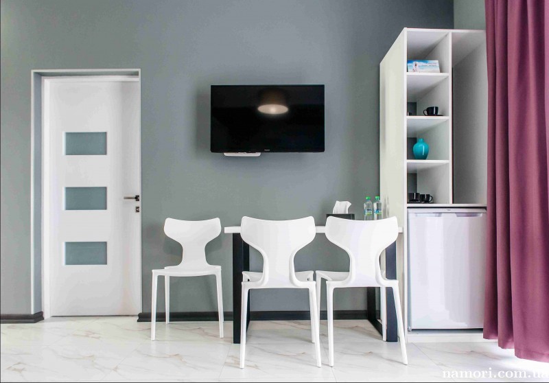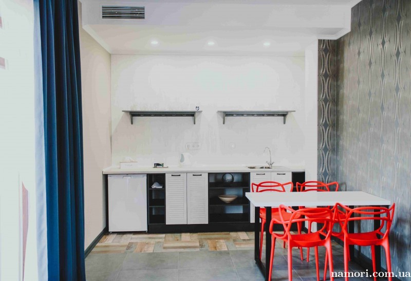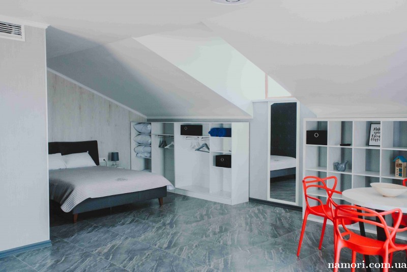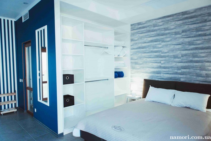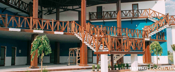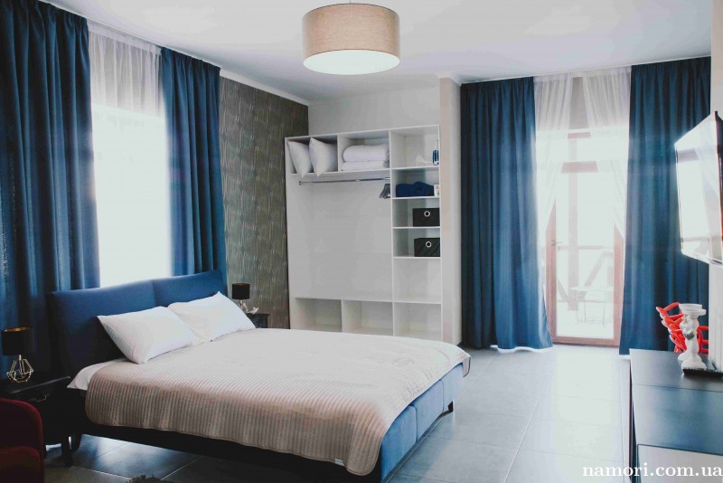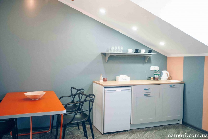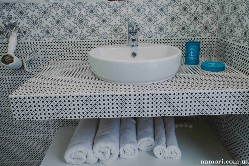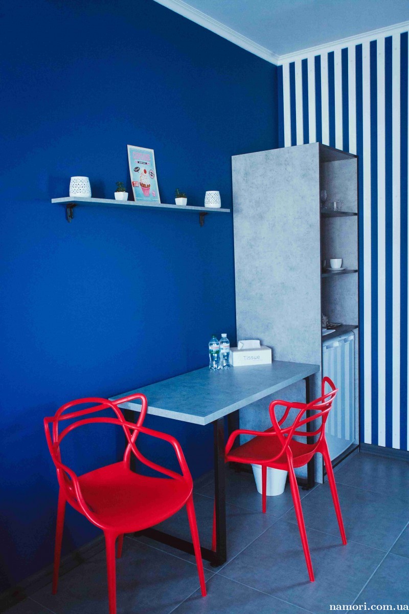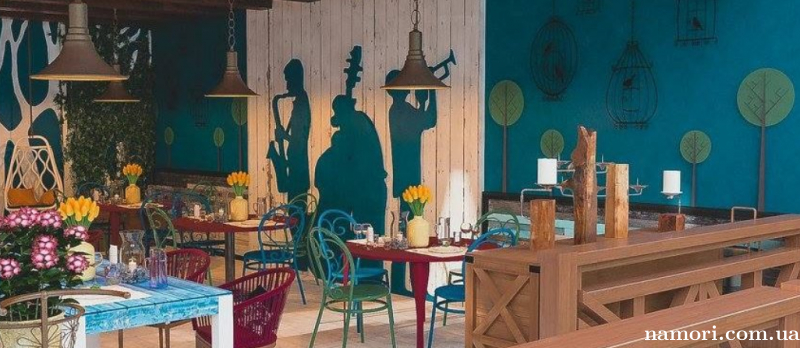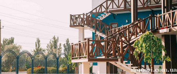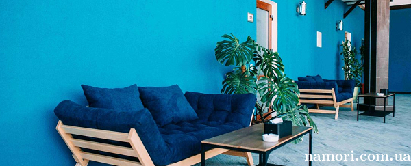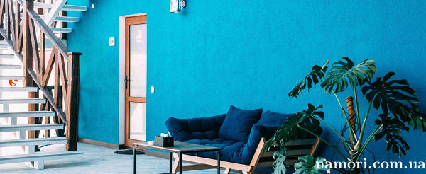 Вся концепція проекту вибудовувалась на незвичайному контрасті. Сміливий та зухвалий бірюзовий колір у поєднанні з традиційними дерев'яними елементами на фасаді, створює відчуття комфорту та затишку, при цьому не втративши своєї неординарності та яскравості. Індивідуально підібраний декор у кожному номері є для нас золотим правилом.