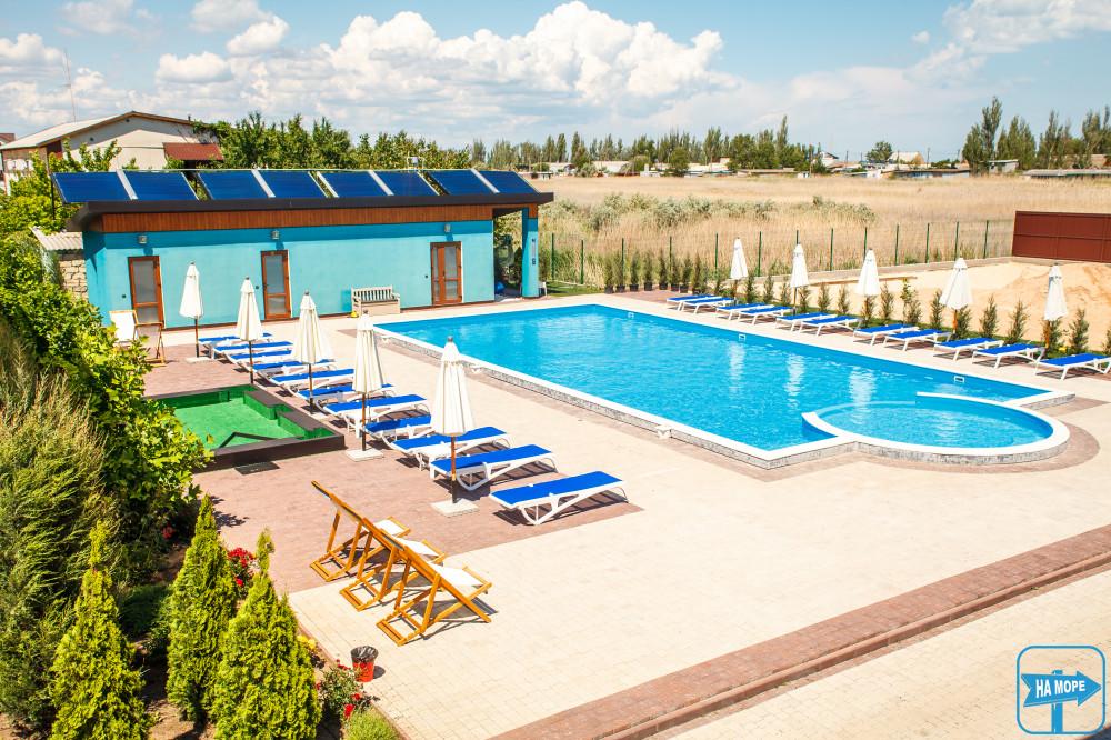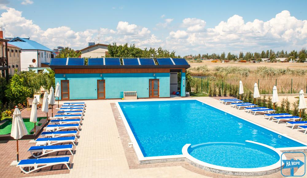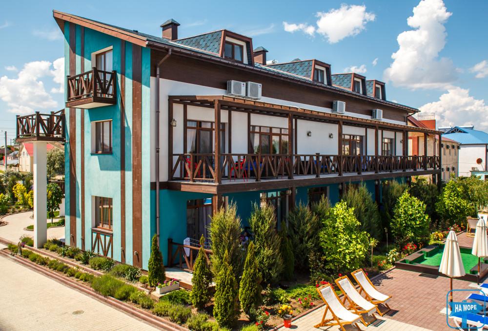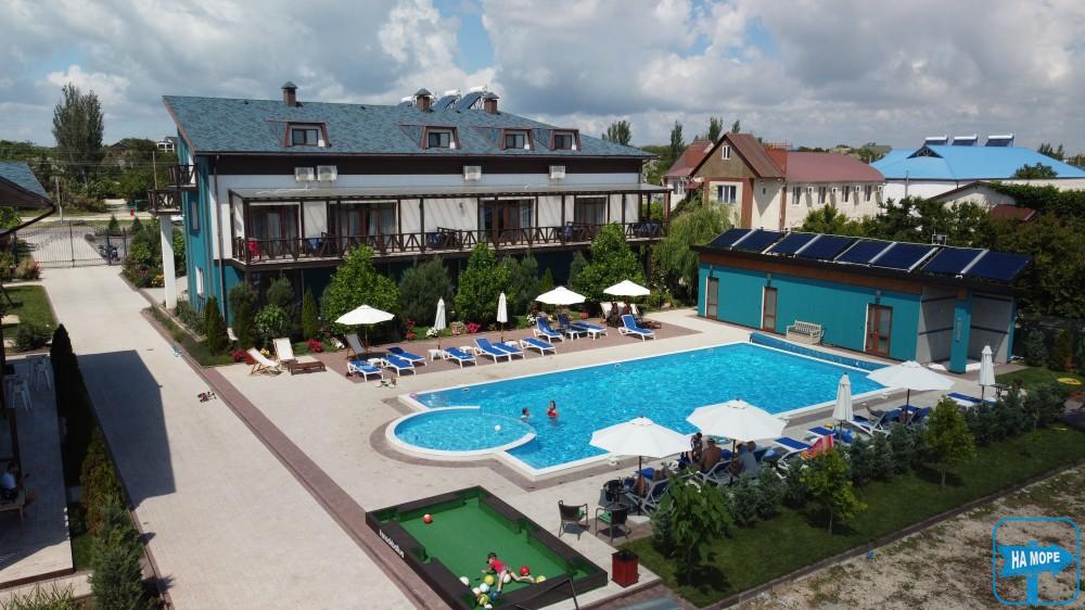 Курорт "Бірюзовий Баклан" розташований на першій береговій межі теплого Азовського моря в центральній частині села Генгірка. Відчуття близькості моря, шелесту хвиль, лагідного бризу, пляжу, сонячного літа та відпочинку лягло в основу спільної ідеї цього проекту. Тому 2-х поверхова будівля і нагадує своєю кутовою формою птаха, що ширяє. Особливостями такого архітектурного рішення стали величезні тераси по периметру будівлі і повноцінний мансардний 3-й поверх.