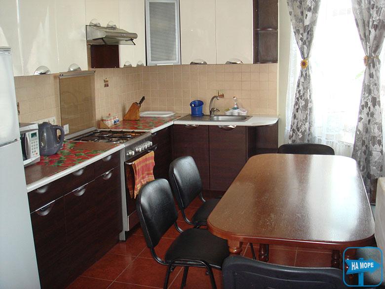 • На першому поверсі знаходиться спальня з двома одномісними ліжками, кухня та санвузол. У кухні є все необхідне для самостійного приготування їжі: газова плита з електропіччю, мікрохвильова піч, холодильник, електрочайник, посуд, цілодобово гаряча та холодна вода. На кухні знаходиться камін, біля якого можна провести вечори у дощову, холодну погоду. Санвузол обладнаний умивальником, унітазом, просторою душовою кабінкою та пральною машинкою автомат.