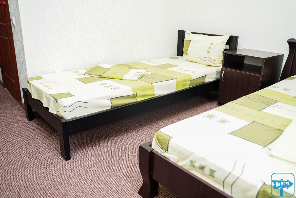 Номер укомплектований сучасними меблями: двоспальне ліжко, односпальне ліжко, шафа для одягу, тумбочі, стіл, стільці, телевізор, холодильник, кондиціонер, окремий санвузол з душовою кабіною, на підлозі килимове покриття – "ковролін". Постільні речі, комплект рушників. Цілодобова подача гарячої та холодної води. Wi-Fi.