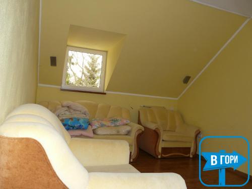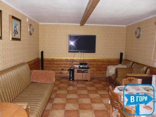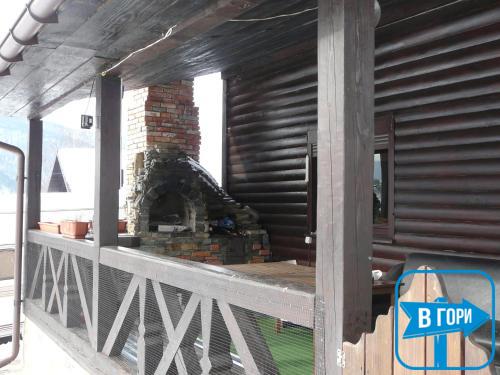 На першому поверсі — кухня (електрична плита, мікрохвильова піч, холодильник, електрочайник, посуд, мийка, обідній стіл), вітальня (м'яка частина, телевізор, стіл зі стільцями), тераса з мангалом.