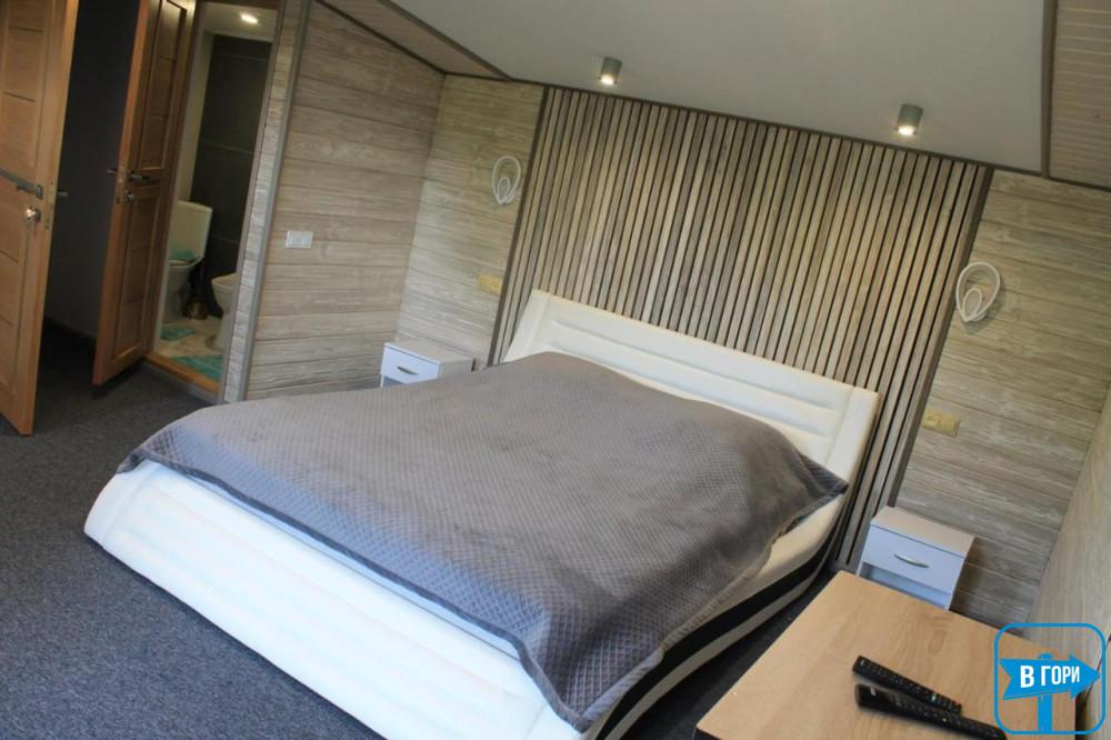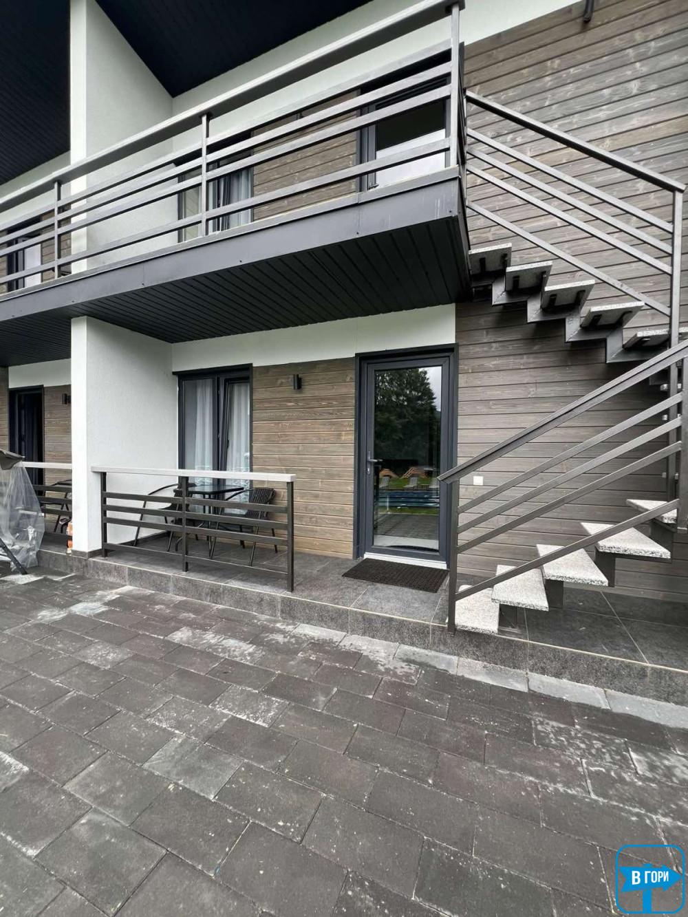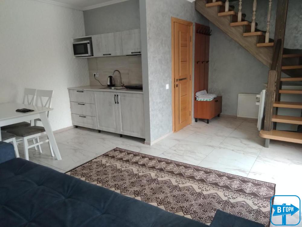 Цей унікальний номер розділений на два поверхи, дозволяючи вам насолоджуватись простором та комфортом. На першому поверсі розташована вітальня з розкладним диваном, шафою для одягу та повністю обладнаною кухнею, включаючи електричну плиту, мікрохвильову піч, холодильник, електрочайник, посуд та мийку. Тут також знаходиться санвузол з душем, туалетом та умивальником. На другому поверсі знаходиться затишна двомісна кімната з двоспальним ліжком, комодом та телевізором для вашого відпочинку. Санвузол на цьому поверсі обладнаний біде, туалетом та умивальником, щоб забезпечити ваш зручний відпочинок. Усі апартаменти мають окремий вхід ззовні, гарантуючи вашу приватність та затишок.