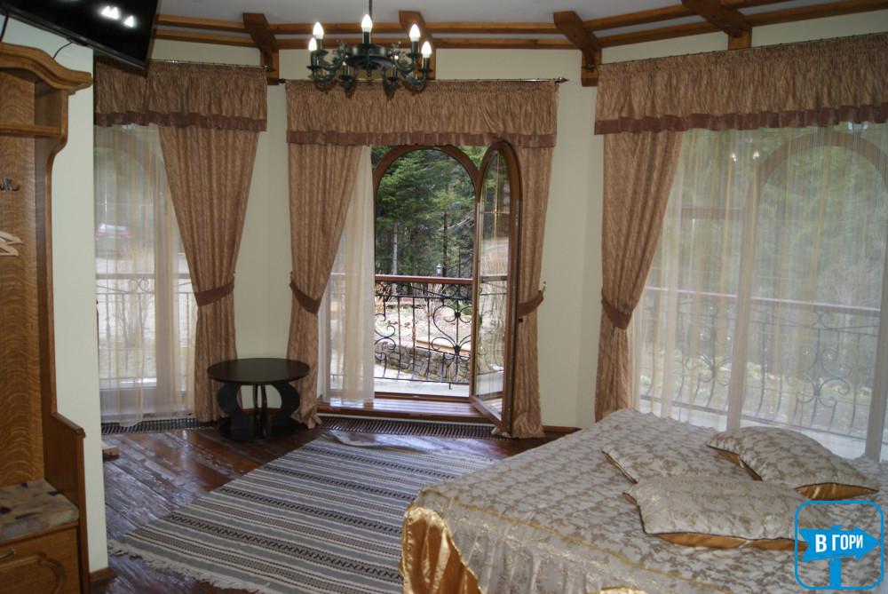З вікон відкривається панорамний краєвид на Карпатські гори та лісові пейзажі.