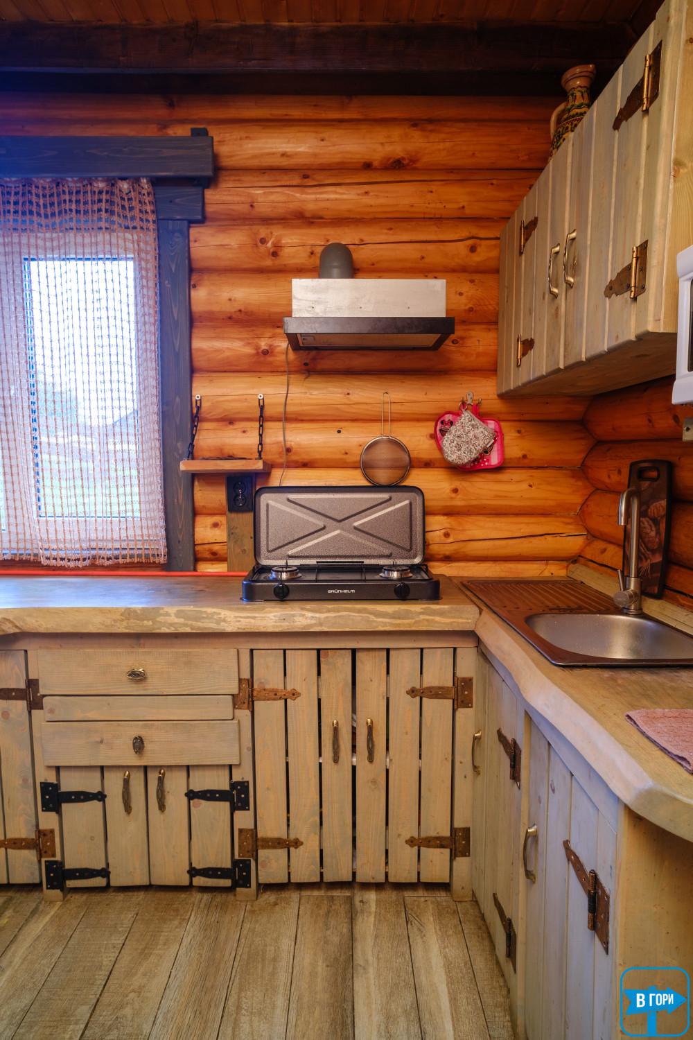- кухня-вітальня (газова плита, мікрохвильова піч, диван, холодильник, чайник, мийка, посуд, обідній стіл, телевізор, вихід на терасу);