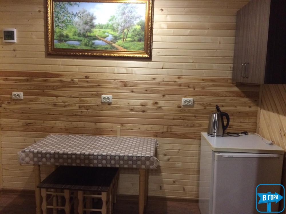 На першому поверсі розташована затишна їдальня з кухонним кутком, обладнана всім необхідним для комфортного перебування. Тут є холодильник для зберігання продуктів, мікрохвильова піч для швидкого приготування страв, а також мийка та набір столового посуду. Ви можете насолоджуватися смачними обідами за обіднім столом або відпочивати на зручному дивані. Особливим бонусом є наявність сауни, де ви зможете розслабитися і зняти втому після активного дня.