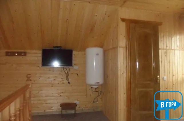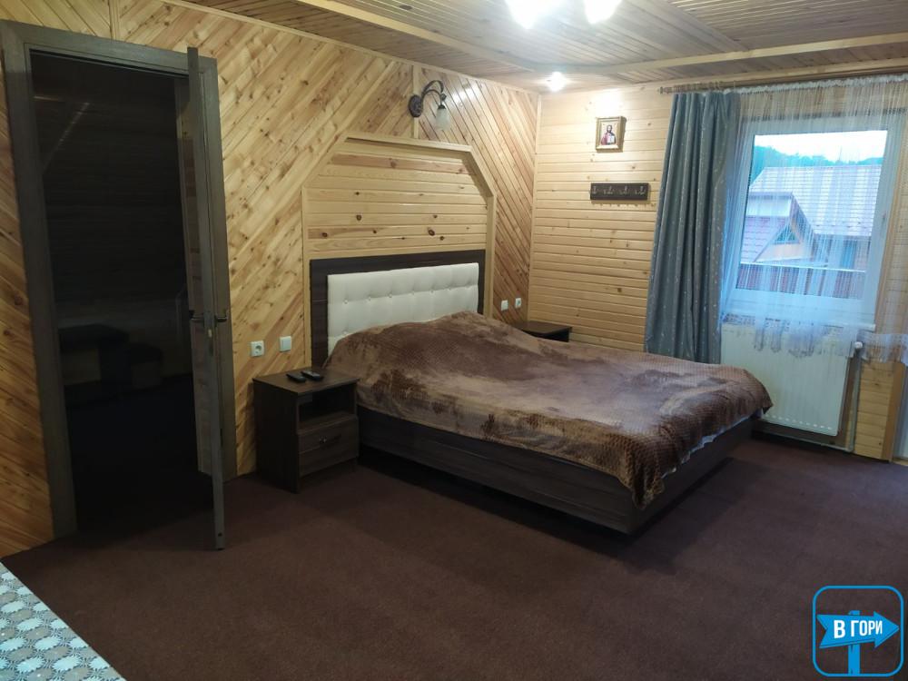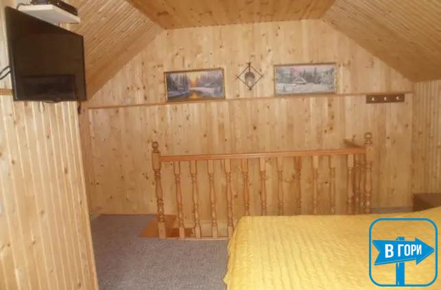 Другий номер - дворівневий люкс, де вас чекає затишне розміщення у двоспальних ліжках на двох рівнях. Тут також є два телевізори, шафа для одягу, холодильник, електрочайник та весь необхідний посуд. Санвузол також знаходиться прямо у номері, щоб забезпечити ваш комфорт.