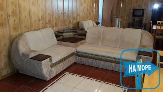 У вітальні: м'який розкладний куточок, стіл зі стільцями, камін, холодильник і телевізор з супутниковим ТБ. Потужна спліт-система розташована між поверхами.