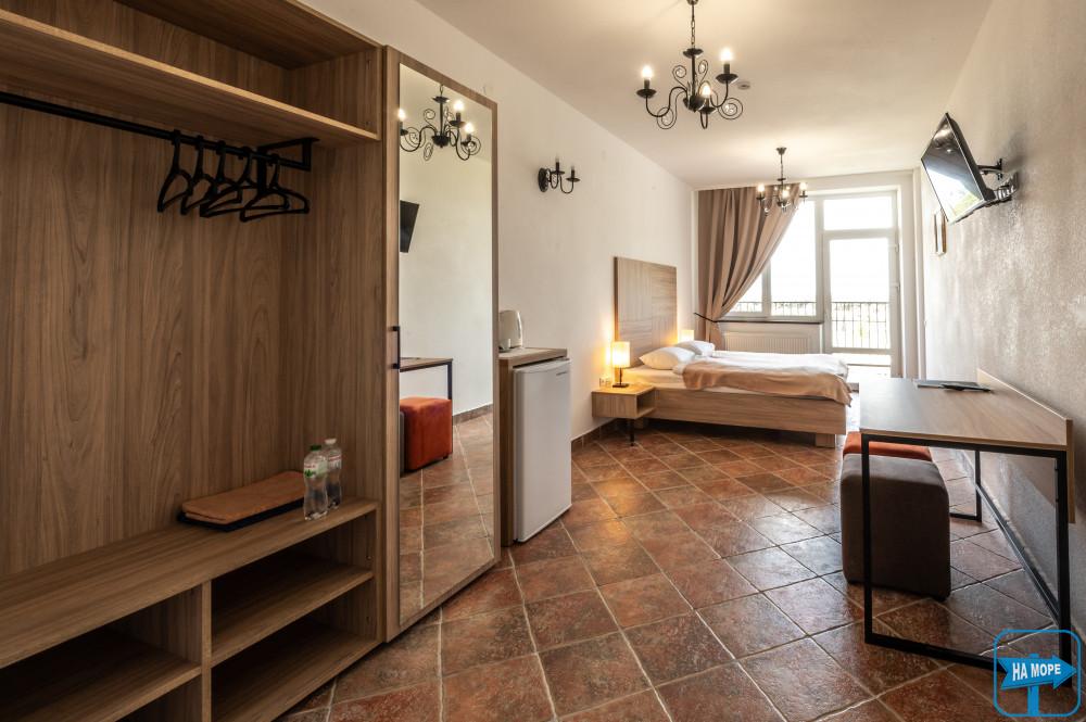 Затишний номер класу «Делюкс» з великим балконом, загальною площею ~40 кв.м, видом на озеро «Сиваш» та озеленену паркову зону.