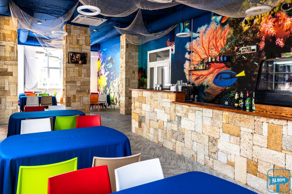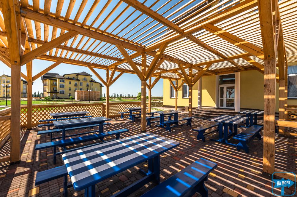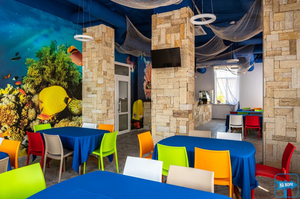 Поруч із дитячим ігровим майданчиком розташоване затишне кафе. Це місце, де можна замовити банкет як для тихого сімейного свята, так і для веселих, запальних вечірок.