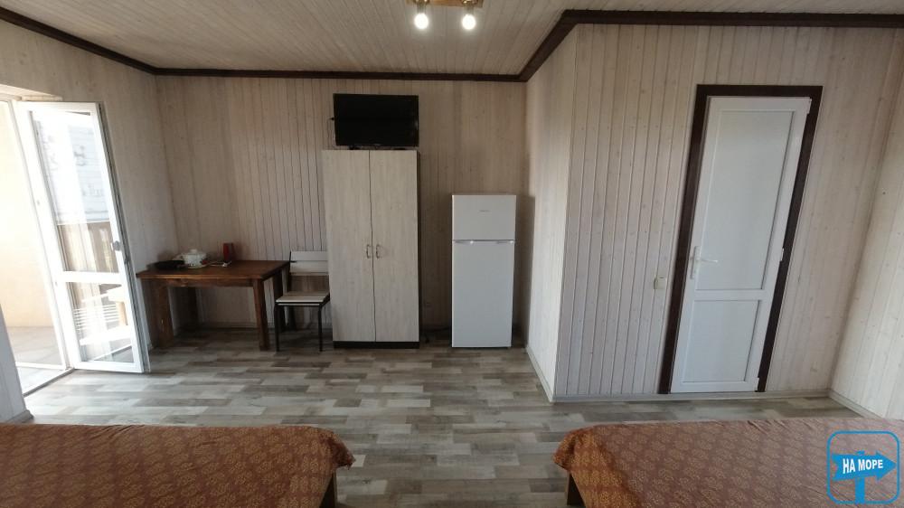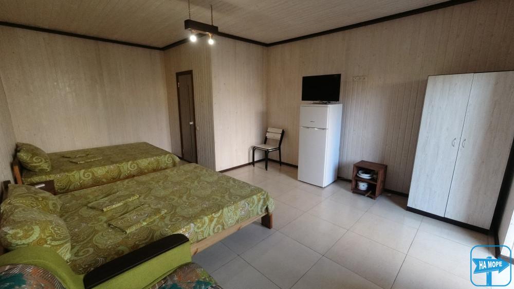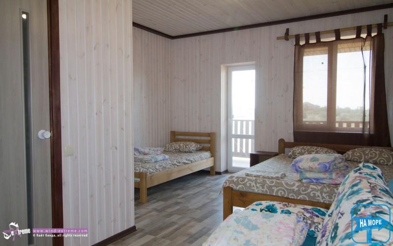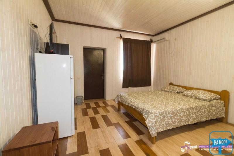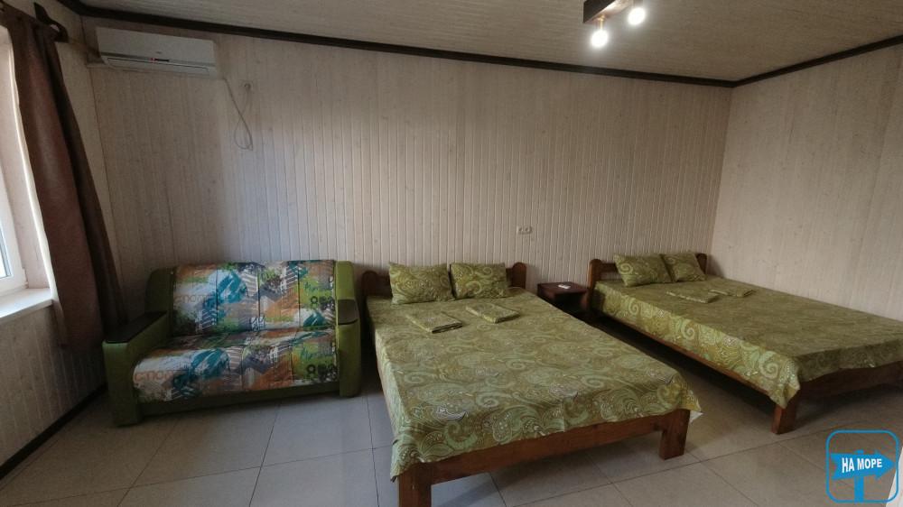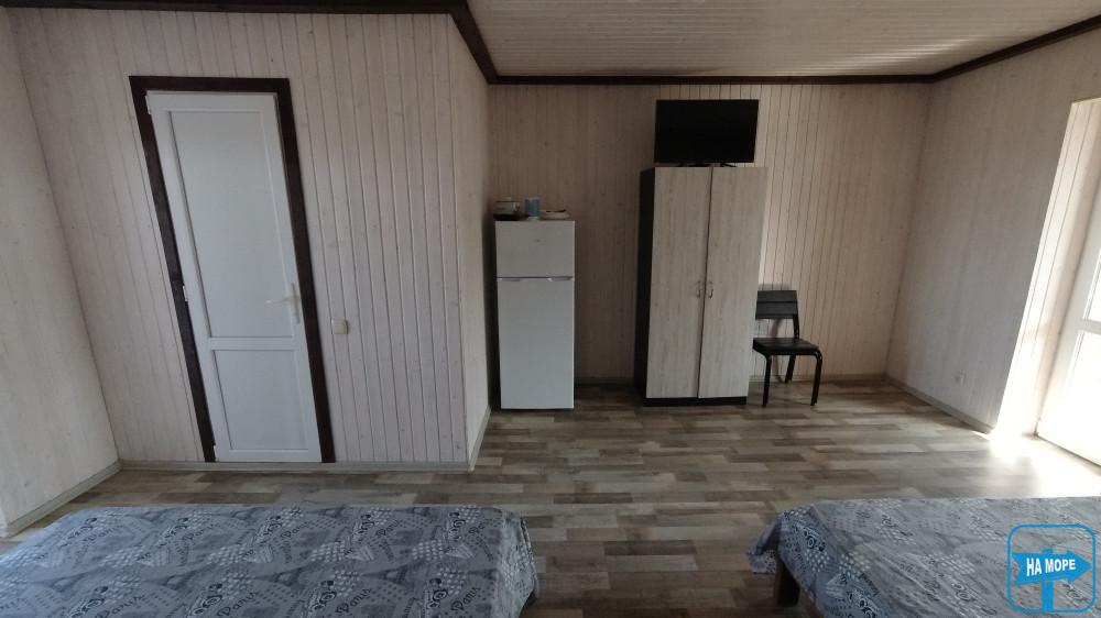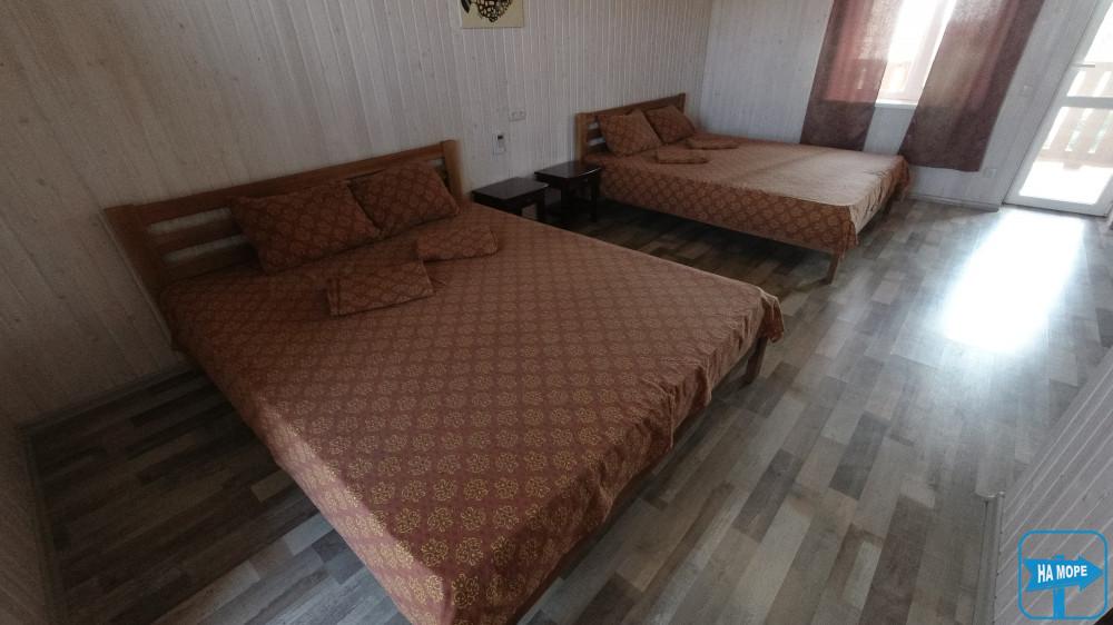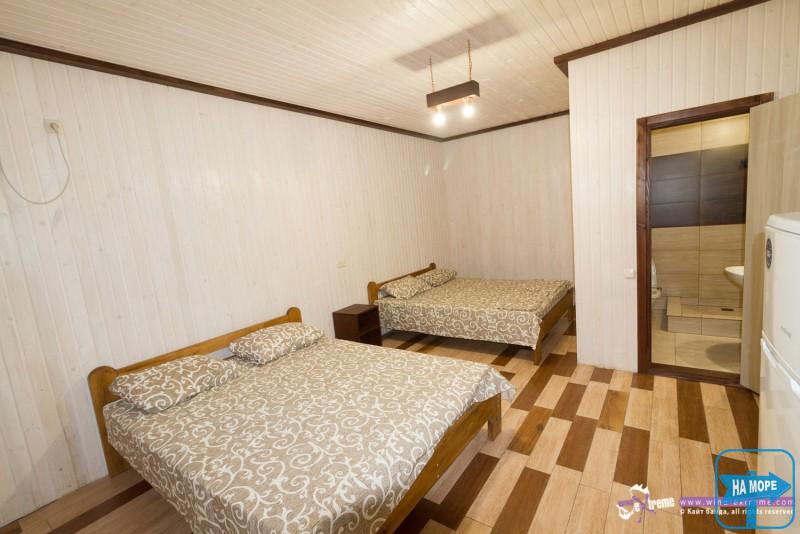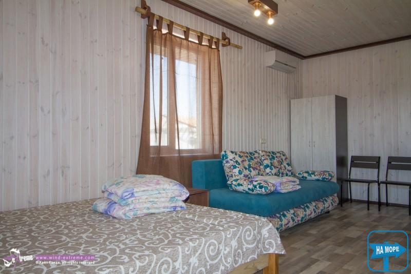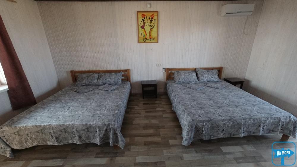 Всі номери на нашій базі відпочинку в Щасливцевому обладнані комфортабельними меблями, в основному двома двоспальними ліжками (з додатковою можливістю встановлення односпальних) і можуть вміщувати до шести осіб, що дуже актуально для сімейного відпочинку на Арабатській стрілці.