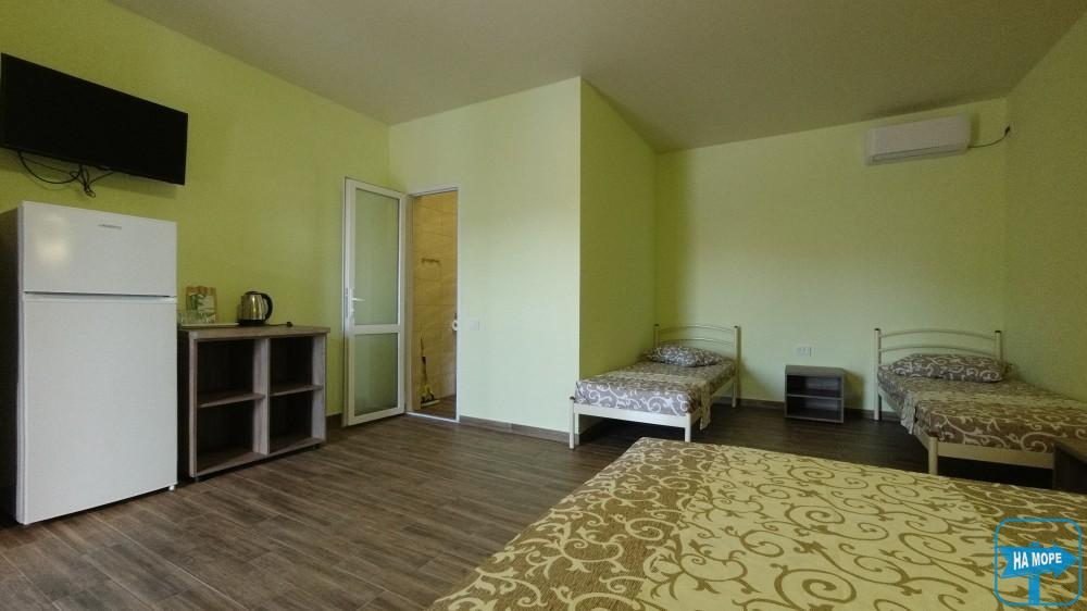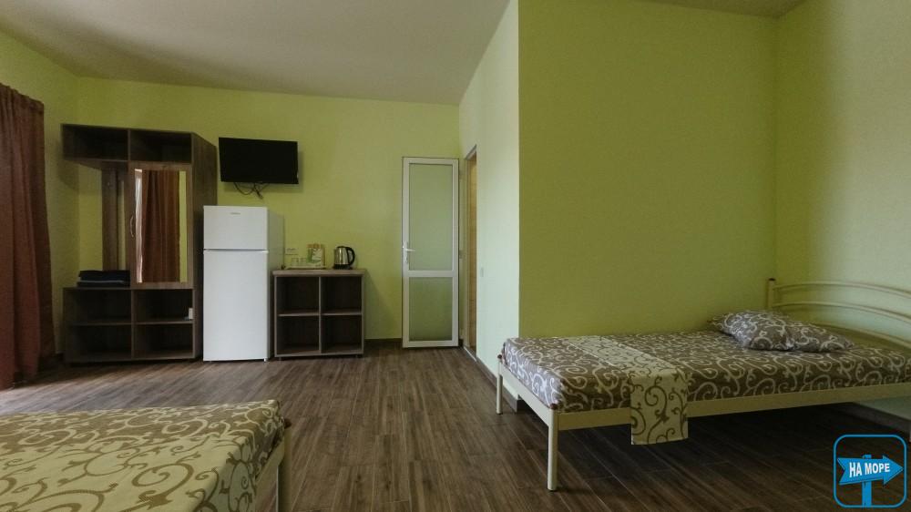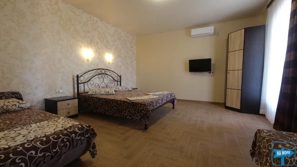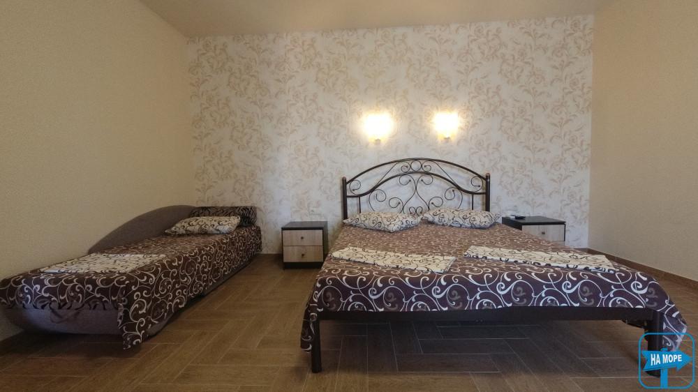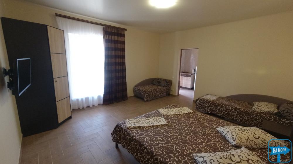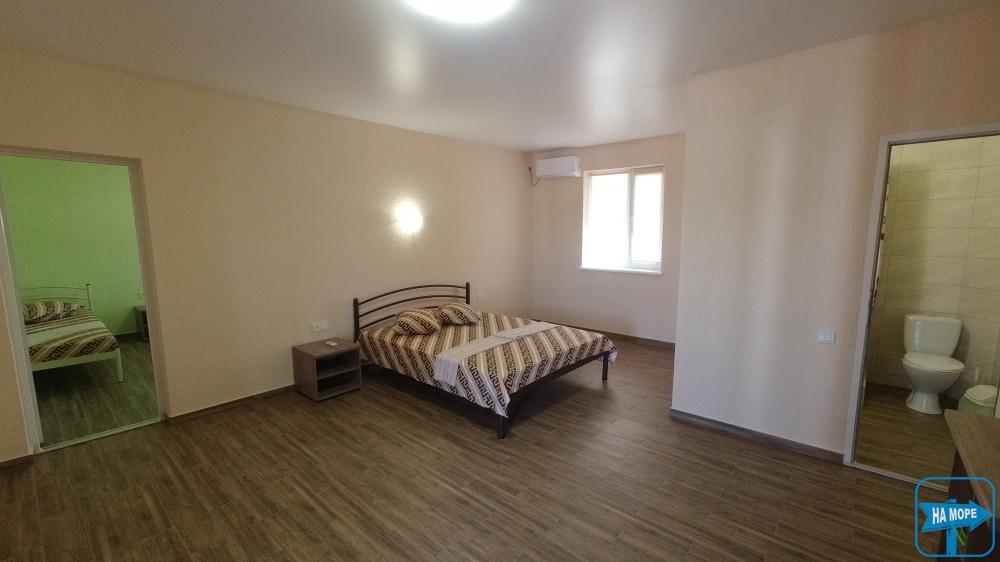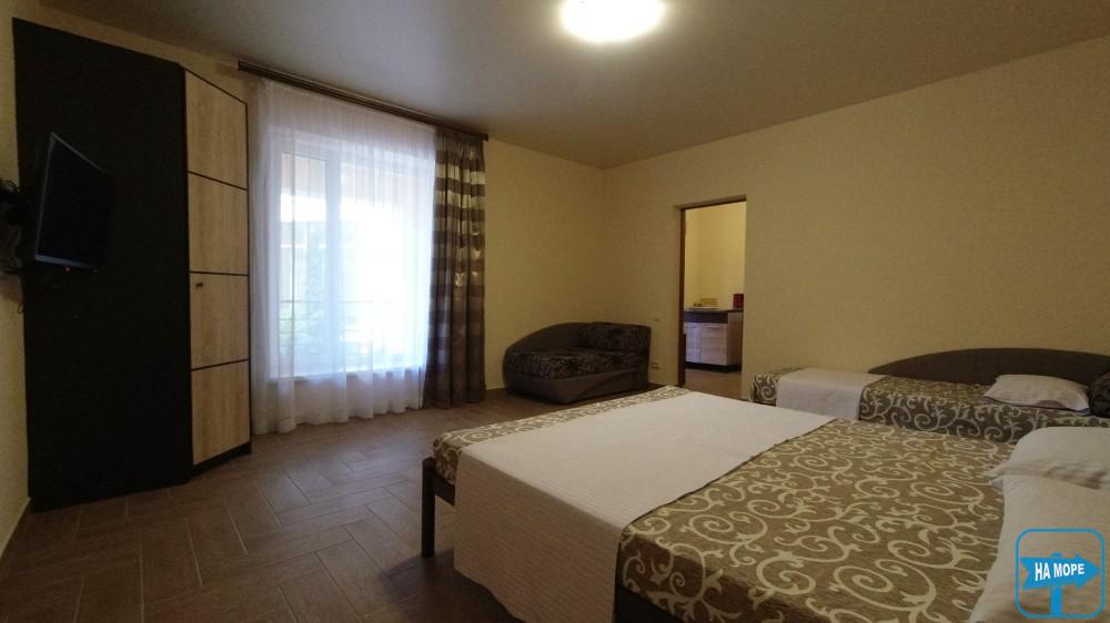 Великий двокімнатний номер площею 50 м2 розрахований на розміщення 5 гостей (2+3 гості). Спальні місця: у першій кімнаті - велике двоспальне ліжко, у другій-велике двоспальне ліжко і одне односпальне ліжко. Кожна кімната укомплектована кондиціонером. У номері є холодильник, електрочайник, телевізор, а також необхідний комплект меблів (шафи, тумбочки, столи).