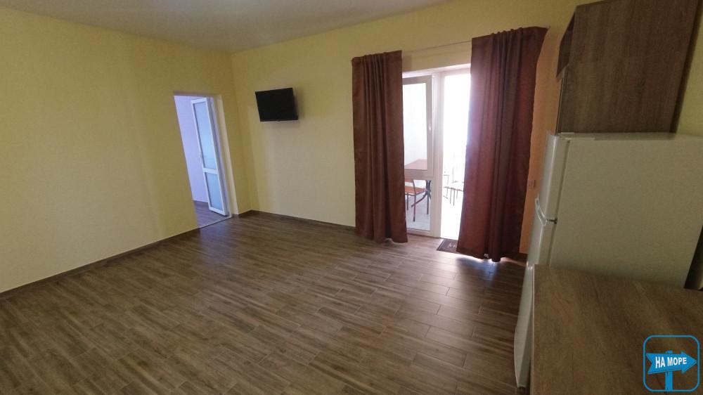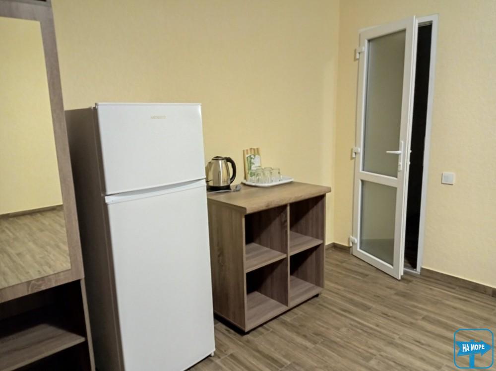 Площа номера 32 м2. Комплектація: кондиціонер, холодильник, електрочайник, телевізор, шафи, столи, тумбочки. Спальні місця: в кожній кімнаті розташоване велике двоспальне ліжко. Біля номера на терасі передбачено стіл та стільці. Тераса з видом на басейн. З вікон 2 та 3 поверхи відкривається вид на море.
