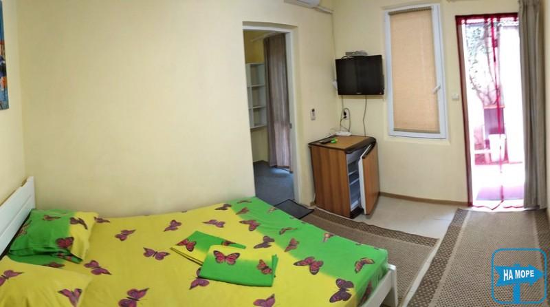 Напівлюкс: двоспальне ліжко, дитячий диван (80 * 170см.), холодильник, супутникове TV, Wi-Fi, кондиціонер, великий стельовий вентилятор, репеленти від комарів, туалет, душ. (кухня загальна на 4 номери)