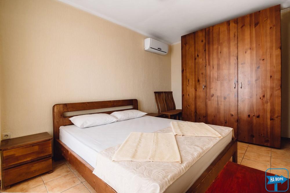 - Мебель. Мягкий диван, двуспальная кровать 160х190 см, стол, стулья и журнальный столик, прикроватные тумбочки и большой шкаф для вещей.